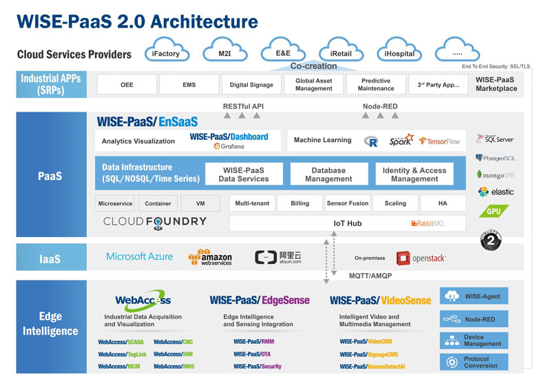 WISE-PaaS 2.0 將 Edge Intelligence、IaaS、PaaS 與 Industrial APPs 緊密結合,形成完整的工業雲端架構。